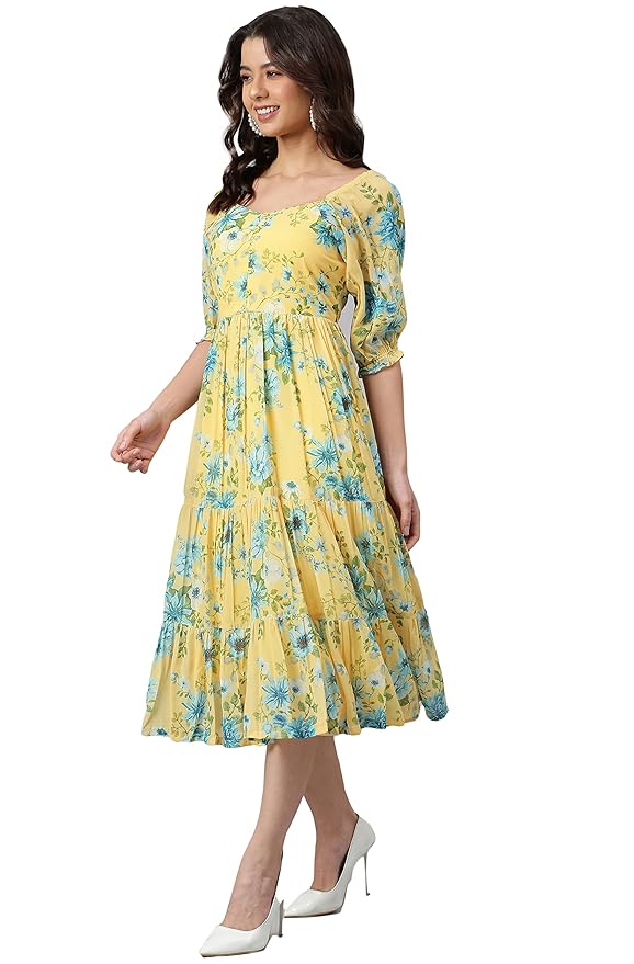 • Style:- Length: 43(inch) | Pattern: Floral Print | Occasion: Casual | Type: Flared | Sleeve Type: 3/4 Sleeve( Puff Sleeve) | Color: Yellow